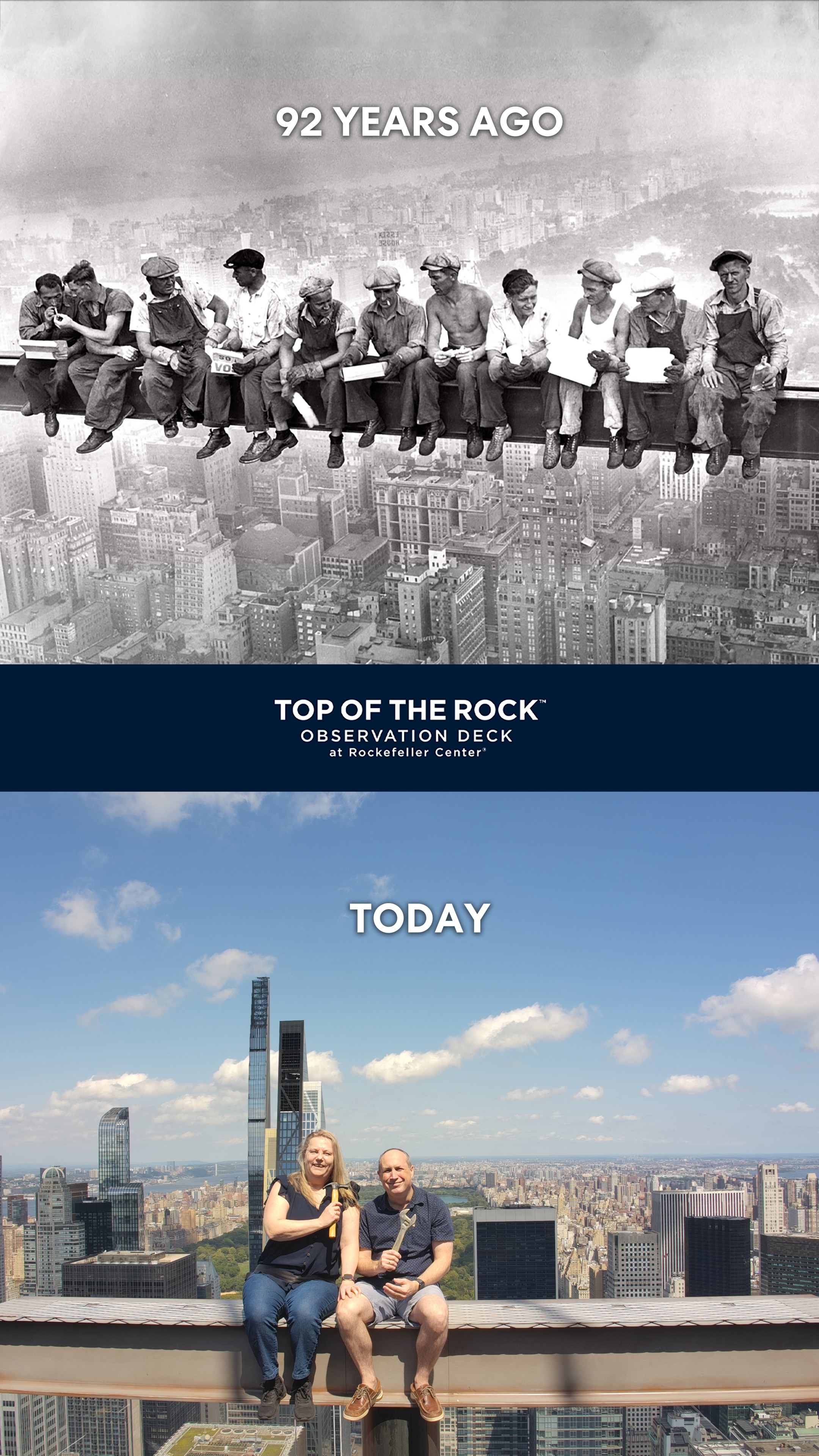 First stop: The Beam. This is where you can recreate the famous 1932 photograph “Lunch Atop a Skyscraper,” which captured eleven ironworkers casually eating lunch on a steel beam high above the city streets. Our turn felt a little less daring – safety harnesses firmly clipped in – but still surreal, dangling our legs against a backdrop of Manhattan’s skyline, Ros was a bit uneasy as it swung around to face outwards and felt like it was over the edge.